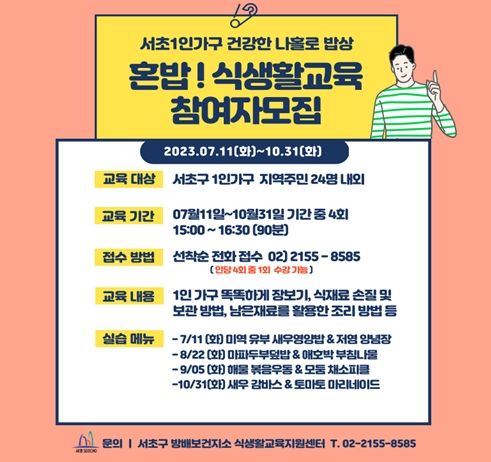 [제주교통복지신문 김강석 기자] 서울 서초구가 1인 가구 청년 및 어르신들의 식생활 개선과 지속적인 건강관리를 위해 오는 11일부터 10월 31일까지 방배보건지소 식생활교육실에서 ‘혼밥! 식생활교육’을 운영한다.