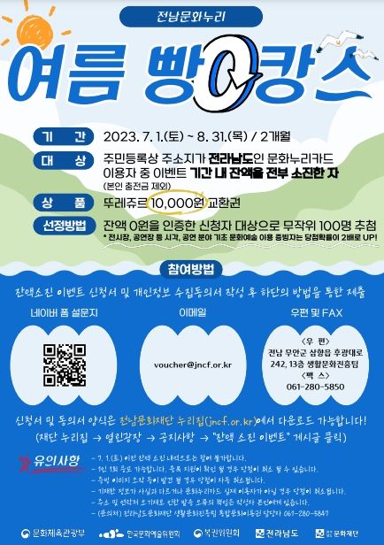 이벤트 참여는 전라남도문화재단 누리집에서 신청서와 개인정보 수집동의서를 내려받아 작성 후 포스터의 QR코드 스캔, 이메일, 우편(포스터 참조) 또는 팩스로 제출하면 된다.