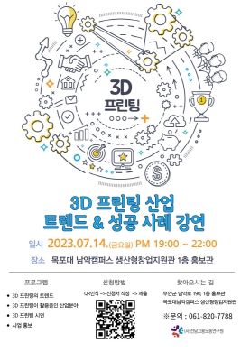 [제주교통복지신문 김강석 기자] 전남 무안군과 (사)전남고용노동연구원은 오는 7월 14일(오후 7시~10시) 목포대학교 남악캠퍼스 생산형창업지원관 1층 홍보관에서 ‘3D프린팅 산업 트렌드 및 성공사례’ 강연을 실시한다.