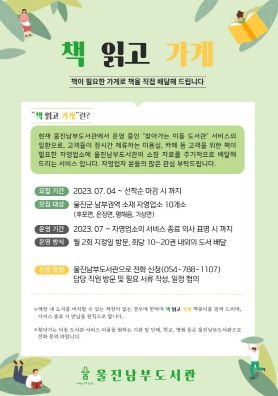 ‘책 읽고 가게’프로그램은 울진 남부권역(평해, 기성, 온정, 후포) 10개소를 대상으로 월 2회, 회당 10~20권 내외의 도서를 업소로 배달해주어 방문객들에게 풍부한 독서 경험을 제공해 줄 예정이다. 또한, 책장이 없는 업소는 책꽂이 대여도 가능하다. 자세한 문의사항 및 신청은 울진남부도서관으로 문의하면 된다.