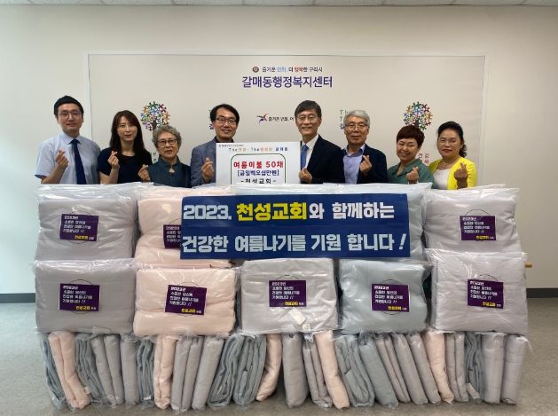 박정렬 위원장은 “매년 지속적인 나눔과 이웃사랑 실천으로 선한 영향력을 행하는 천성교회에 감사드리며, 갈매동 지역사회보장협의체 위원들도 무더운 여름 취약가구에 대해 지속적인 관심을 갖고 살피도록 하겠다.”라고 전했다.