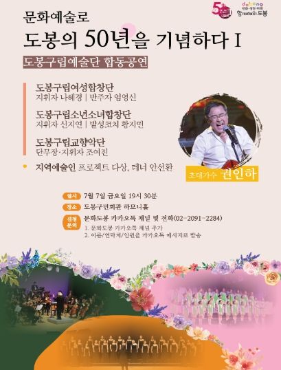 [제주교통복지신문 김강석 기자] 도봉구가 출범 50주년을 맞아 7월 7일부터 8일, 양일간 도봉구민회관 하모니홀에서 지역의 문화예술인과 함께 ‘도봉의 50년을 기념하다’ 행사를 개최한다.