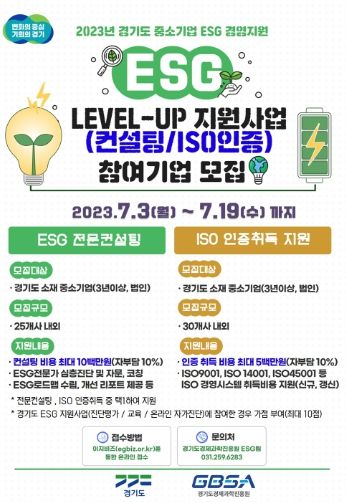 경기도는 오는 19일까지 이지비즈를 통해 환경·사회·투명(ESG) 경영 전문 컨설팅은 25개 사, 환경·사회·투명(ESG) 경영 관련 국제 인증 취득 지원은 30개 사를 모집한다.