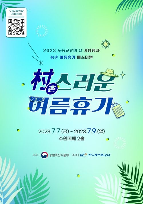 [제주교통복지신문 김강석 기자] 농림축산식품부는 7월 7일부터 9일까지 수원메쎄에서'2023 도농교류의 날 기념행사 및 농촌 여름휴가 페스티벌(축제)'을 개최한다.