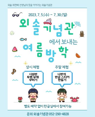 또한 외솔기념관은 7월 한 달 동안 ‘외솔기념관에서 보내는 여름방학’이라는 주제로 △나만의 투명 부채 꾸미기 △나만의 한글 스티커 만들기 등의 체험 프로그램을 운영한다.