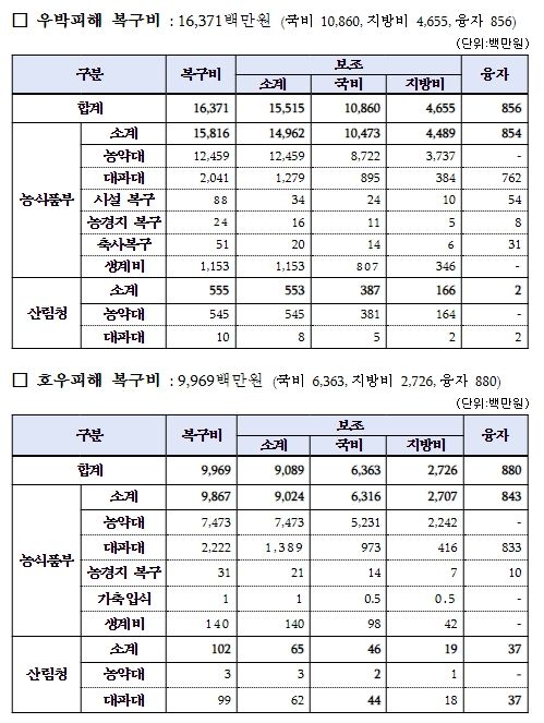 정부는 우박(6.8.~6.15.)으로 인해 피해를 입은 경북, 충북, 강원 등 7개도 농가를 대상으로 지자체 피해조사(~7.3.)와 농업재해대책심의회(7.4.~7.7.)를 거쳐 복구비 16,370백만 원을 확정하여 7월 7일 지원한다. 아울러, 5월 호우피해(전남, 제주 등 5개도, 8,250ha)는 피해조사 및 심의를 거쳐 6월 30일에 복구비 9,969백만원을 확정하여 지자체에 교부했다.