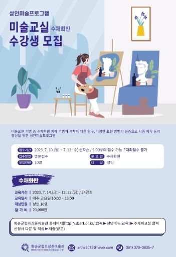 ‘미술 교실 수채화 반’ 2강좌 수강 신청 기간은 7월 10일부터 7월 12일까지이며, 프로그램에 참여하고자 하는 관내 주민(만 20세 이상 성인)은 누구나 신청할 수 있다.