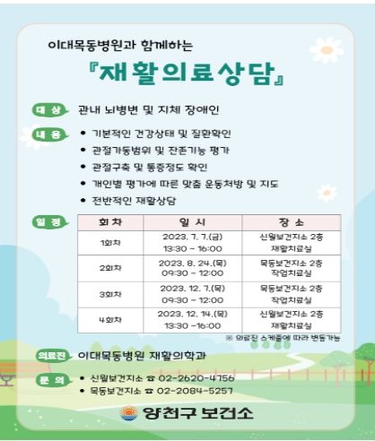 [제주교통복지신문 김강석 기자] 양천구는 이대목동병원과 함께 관내 뇌병변 및 지체장애인을 대상으로 이달부터 일대일 맞춤형 재활의료상담을 운영한다고 밝혔다.