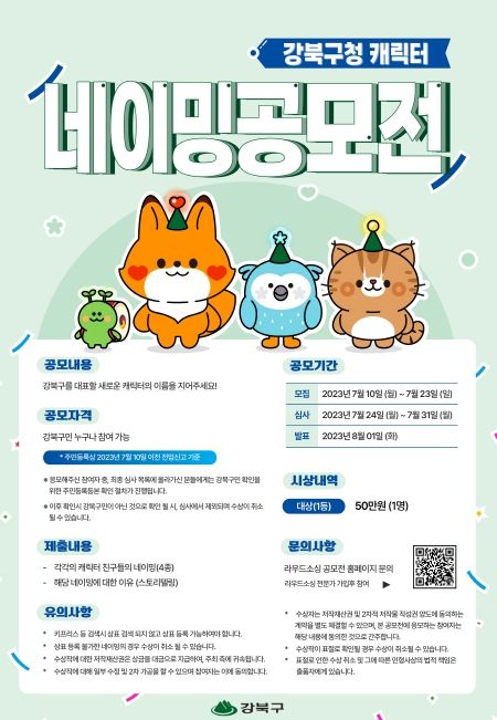[제주교통복지신문 김강석 기자] 서울 강북구는 구의 대표 캐릭터 이름을 짓기위해 10(월)부터 23일(일)까지 ‘캐릭터 네이밍 공모전’을 개최한다고 밝혔다.