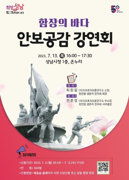 [제주교통복지신문 김강석 기자] 성남시는 오는 7월 13일 오후 4시~5시 30분 시청 1층 온누리에서 ‘안보 공감 강연회’를 개최한다.