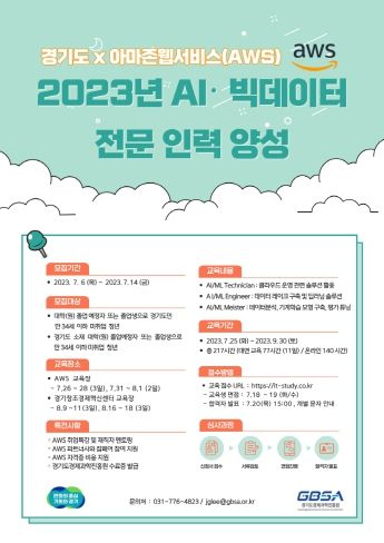 [제주교통복지신문 김강석 기자] 경기도와 경기도경제과학진흥원은 인공지능(AI)·빅데이터 분야의 취업 연계를 위해 ‘AWS AI(인공지능)·빅데이터 전문인력 양성 과정’을 시행한다고 7일 밝혔다.