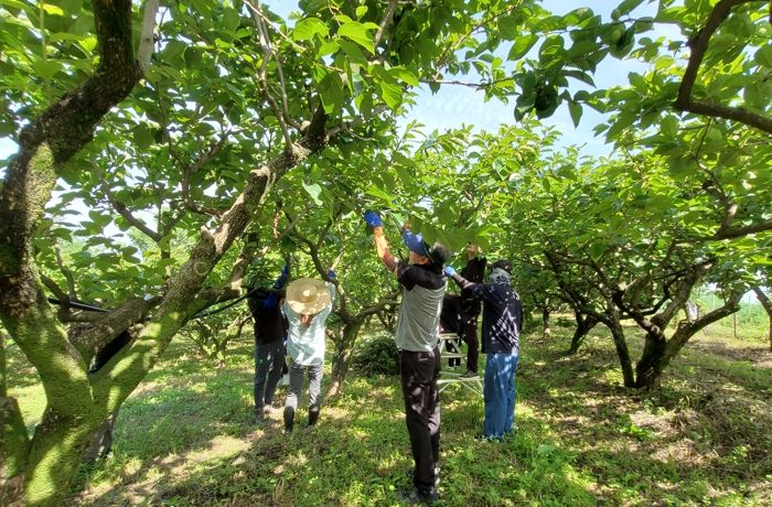 지난 6일 성송면사무소 직원들은 농가를 찾아 수확물의 상품성을 높이기 위한 감나무 열매솎기 작업에 힘을 보탰다.