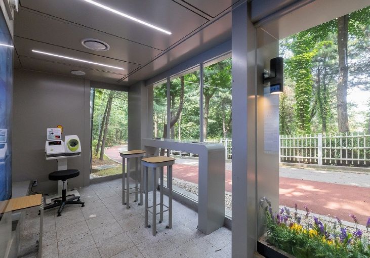 쉼터에서는 스마트폰 충전도 가능하고 주변 정보 표시와 힐링 음악 송출 등 다양한 편의 서비스도 제공한다.