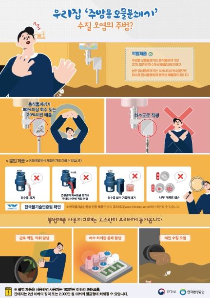 주방용 오물분쇄기는 임의로 조작할 수 없는 일체형으로 음식물 찌꺼기의 20% 미만만 공공하수도로 배출되고 남은 찌꺼기는 80% 이상 회수통으로 회수해 각 가정에서 음식물종량제 봉투로 배출시킬 수 있는 인증된 제품을 사용해야 한다.
