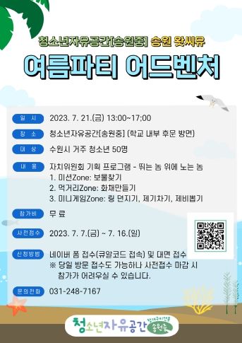 [제주교통복지신문 김강석 기자] 수원시청소년청년재단 청소년자유공간[송원중]은 오는 7월 16일까지 7월 송원 왓씨유 ‘여름파티 어드벤처’행사 참가자를 모집한다.
