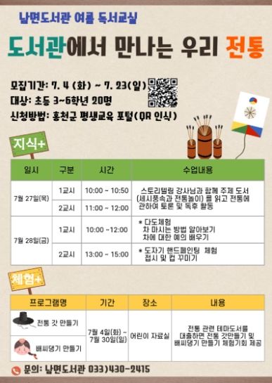 남면도서관은 도서관에서 만나는 우리전통을 주제로 7월 27일부터 7월 28일까지 초3~6학년을 대상으로 '세시풍속과 전통놀이'읽고 전통에 관한 토론 및 독후활동, 다도 체험 차 마시는 방법 및 예의 배우기, 도자기 핸드페인팅 체험(접시 및 컵 꾸미기)을 실시한다.