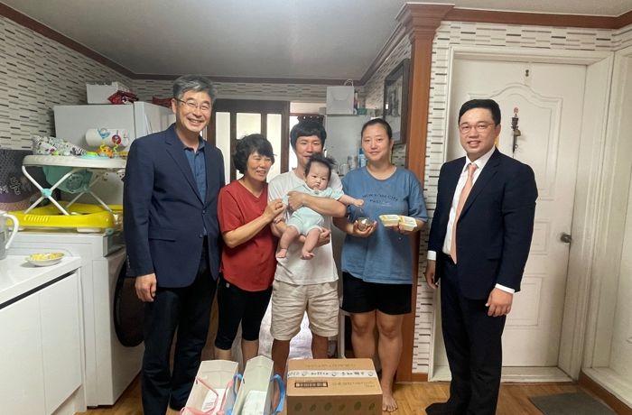 민선8기 1주년을 맞은 의미있는 날 군과 에코맘은 지난 2월 출생한 아이를 양육하는 청년부부 가정을 직접 찾아 이유식과 이유식기 세트를 전달해 육아를 격려하고 아기와 부부 모두의 건강을 기원하는 뜻깊은 시간을 가졌다.