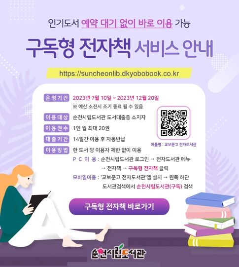 [제주교통복지신문 김강석 기자] 순천시는 오는 10일부터 순천시민이 원하는 책을 언제 어디서든 이용할 수 있는‘구독형 전자책 서비스’를 운영한다.