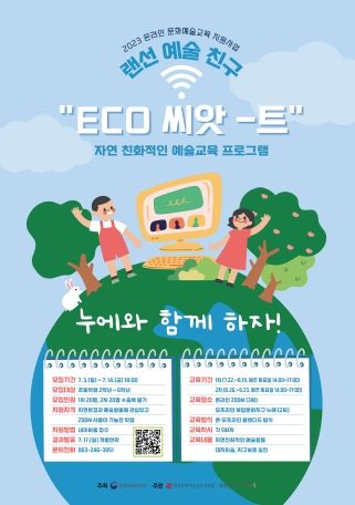 온라인 문화예술교육지원사업 ‘랜선예술친구-ECO씨앗-트’는 올 해 신규 사업으로 오는 22일부터 9월 23일까지 진행될 예정이며, 지역에 관계없이 전국 초등학생 2~6학년을 대상으로 오는 14일까지 모집한다.