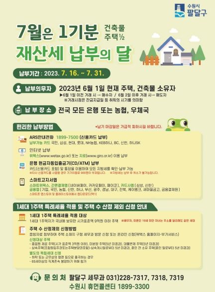 [제주교통복지신문 김강석 기자] 수원시 팔달구는 6월 1일 현재 주택 및 건축물 소유자를 대상으로 2023년 7월 정기분 재산세 105,456건 258억원(주택1기분 114억원, 건축물 144억원)을 부과고지했다. 이는 전년 부과세액대비 2.26%가 감소한 것이다.