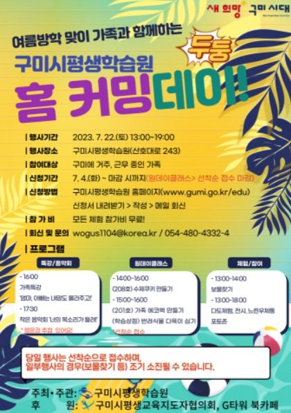 [제주교통복지신문 김강석 기자] 구미시는 22일 평생학습원에서 여름방학을 맞이해 가족과 함께 하는 ‘평생학습 홈커밍데이’ 행사를 개최한다.