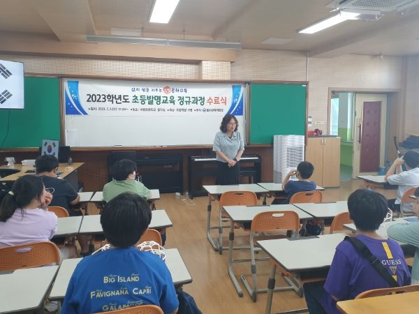 발명교육 정규과정은 관내 3-6학년 학생을 대상으로 발명과 창의성을 키우고, 미래 역량을 키우는 교육프로그램이다. 지난 2023년 4월 19일부터 7월 5일까지 10회에 걸쳐 발명, 로봇코딩, 드론, 가상현실 구현, 메이커교육과 관련된 40차시의 과정을 수행하면서 4차 산업혁명시대 핵심 역량을 키울 수 있었다. 이날 수료식에서는 양춘희 교육지원과장의 축사와 함께 수료증 전달, 기념 촬영 순으로 진행됐으며 12명의 교육생에게 수료증이 전달됐다.