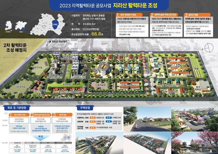 지역활력타운은 지방소멸 위기에 대응하고 지방 이주를 원하는 수요의 안정적인 지역 정착을 지원하기 위해 7개 부처가 지원사업을 연계하여 주거·돌봄·일자리 등 복합 주거거점을 조성하는 사업으로 남원시의 경우 운봉읍 용산리 일원에 은퇴자 및 귀향·귀촌자를 위한 78세대 주거 공간인 ‘지리산 활력타운’을 조성한다.