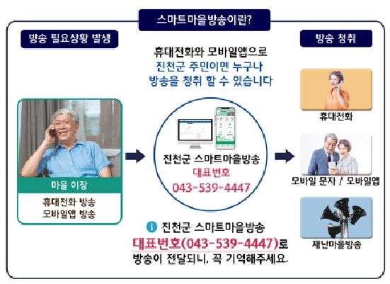 스마트 마을방송시스템이란 각 마을 이장이 스마트폰에 설치된 앱이나 ARS를 이용해 방송을 하면 기존 무선 마을방송 뿐만 아니라 시스템에 등록된 주민의 휴대전화 및 유선전화로 방송내용을 송출하는 시스템이다.
