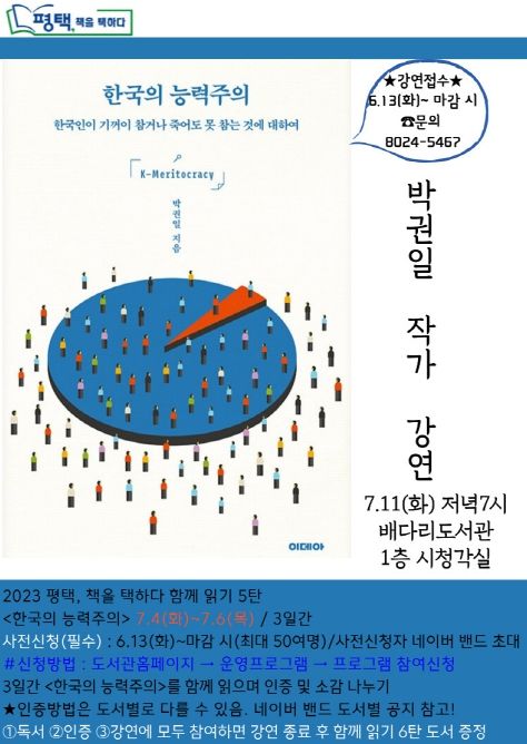 [제주교통복지신문 김강석 기자] 평택시 배다리도서관에서 오는 11일 화요일 저녁 7시 '한국의 능력주의' 박권일 작가 초청 강연을 진행한다.