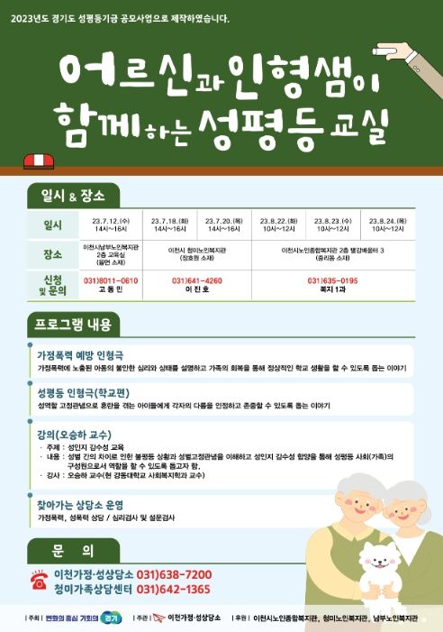 [제주교통복지신문 김강석 기자] 이천가정·성상담소에서는 ‘어르신과 인형샘이 함께하는 성평등 교실’ 참가자를 모집한다.