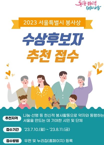 추천권자는 행정기관 또는 행정기관에 등록된 민간단체이며, 미등록 단체 및 개인은 30명 이상이 연서한 추천서를 첨부하여 추천할 수 있다. 추천 서류는 7월 10일부터 서울시 누리집 ⇒ 서울소식 ⇒ 고시·공고 ⇒'2023 서울특별시 봉사상 추천 공고'에서 내려받을 수 있다.