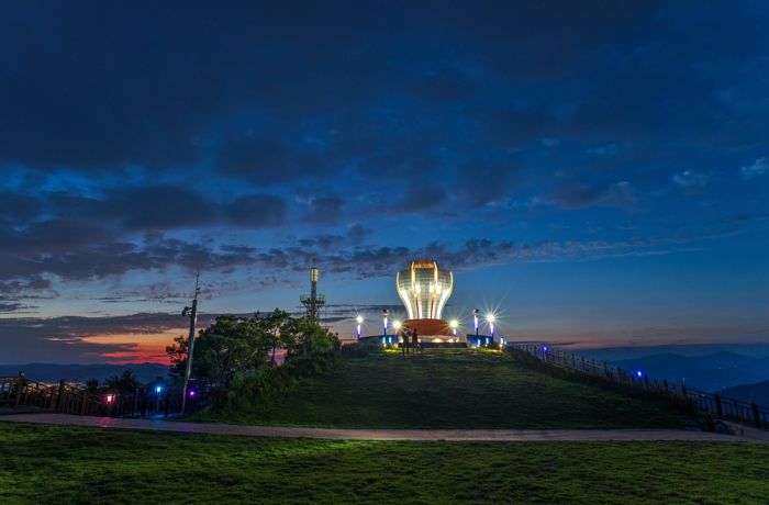 정상에 설치된 매화 형상 메탈아트 봉수대는 낮에는 은빛으로 빛나고 어둠이 내리면 금빛으로 타오르며 신비한 아우라를 뿜어낸다.