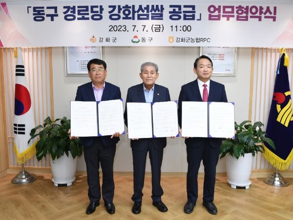 협약식에는 유천호 강화군수, 김찬진 동구청장, 김영윤 강화군농협쌀공동사업법인 대표가 참석했으며, 이달부터 동구 경로당 39개소에 강화섬쌀 4.6톤이 공급된다.