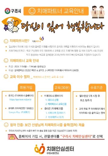 치매 극복을 위한 동반자 활동에 참여를 희망하는 개인, 단체 및 기관은 구리시 치매안심센터로 문의하면 된다.