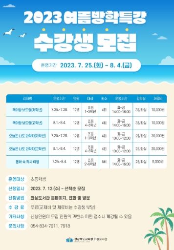 [제주교통복지신문 김강석 기자] 경상북도교육청 의성도서관은 여름방학을 맞아 7월 25일부터 8월 4일까지 관내 초등학생을 대상으로 여름방학특강을 운영한다고 밝혔다.