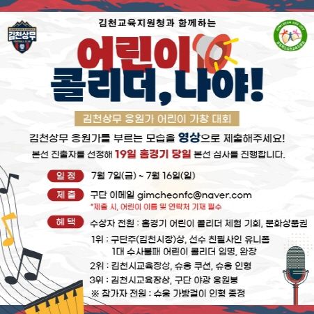 김천상무 공식홈페이지 팬-응원가 소개 내에 있는 응원가 17곡 중 최소 1곡 이상을 부르는 영상을 촬영해 간단한 사연과 함께 김천상무 공식 메일로 전송하면 응모가 완료된다. 제출 시 어린이 이름 및 연락처는 필수 기재해야 한다. 응모 기간은 7일(금)부터 16일(일)까지다. 참여 대상은 초등학생 이하 어린이 팬이다. 단체도 참여 가능하며 상품은 1개로 제한된다.
