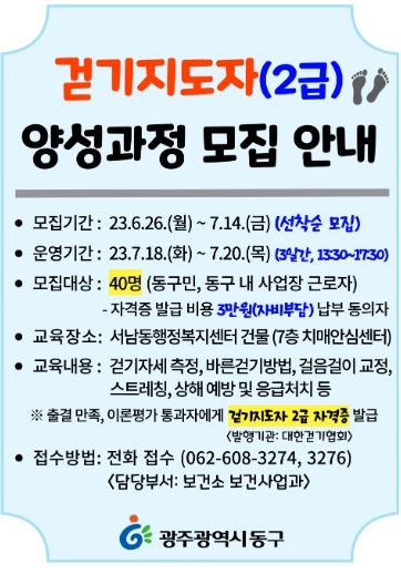 [제주교통복지신문 김강석 기자] 광주 동구는 1530(1주 5일 30분 이상) 걷기 문화 활성화 사업 일환으로 ‘걷기지도자(2급) 양성 과정’ 참여자를 오는 14일까지 모집한다고 밝혔다.