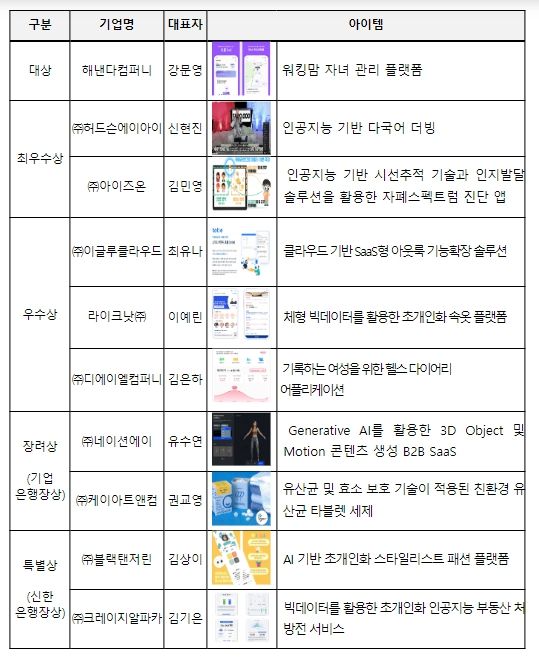참가팀에 대해 관련 전문가들의 서면평가와 발표평가 등 심도 있는 심사를 거쳐 총 34팀*을 최종 선정했으며, 영예의 대상 (중소벤처기업부장관상, 상금 2,000만원)은 ‘워킹맘들의 자녀 관리 플랫폼’을 개발해 사업화를 계획 중인 ‘해낸다컴퍼니 강문영 대표’가 차지했다.