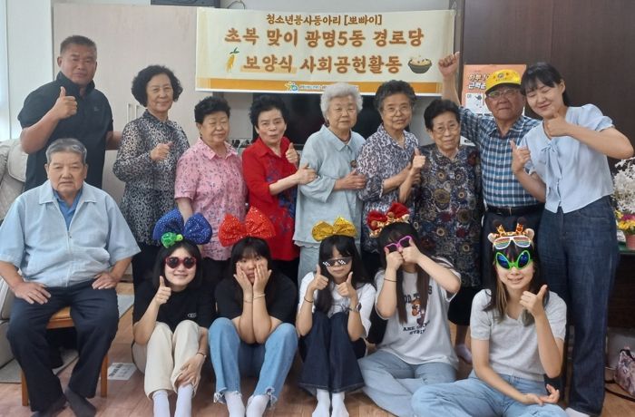 이번 활동은 광명5동 어르신들이 무더운 여름을 건강하게 보내길 바라는 마음으로 기획됐다. 청소년봉사동아리 [뽀빠이] 청소년들은 여름철 보양식을 주제로 삼계탕을 만들어 나누고, 할머니와 할아버지를 위해 무더위를 날려줄 즐거운 노래도 불러드리며 의미를 더했다.