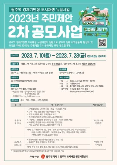 [제주교통복지신문 김강석 기자] 광주광역시는 ‘2023년 광주역 도시재생 주민제안 2차 공모사업’ 참여자를 10일부터 오는 28일까지 모집한다.