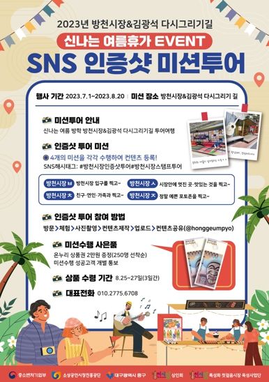 [제주교통복지신문 김강석 기자] 대구 중구는 방천시장이 8월 20일까지 ‘방천시장 SNS 인증샷 투어’ 이벤트를 진행한다고 밝혔다.