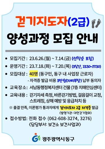 과정 이수자는 대한걷기협회에서 발급하는 걷기지도자 2급 자격증을 취득할 수 있다. 참여를 원하는 주민은 동구보건소 보건사업과로 전화 접수하면 된다. 교육비는 무료, 자격증 발급 비용(3만 원)은 개인 부담이다.