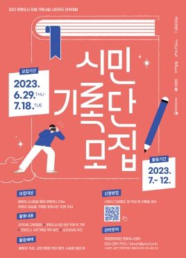 한편 문화도시 시민기록단 신청 접수는 오는 18일 오후 6시까지며, 자세한 내용은 포항문화재단 홈페이지 공지 사항에서 확인할 수 있다. 관련 문의는 포항문화재단 문화도시센터로 하면 된다.
