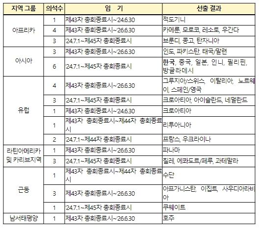 이번 선거 결과, 아시아 지역에서는 우리나라를 비롯한 중국, 일본, 인도, 인도네시아 등 총 9개 국가가 이사국으로 선출됐다.