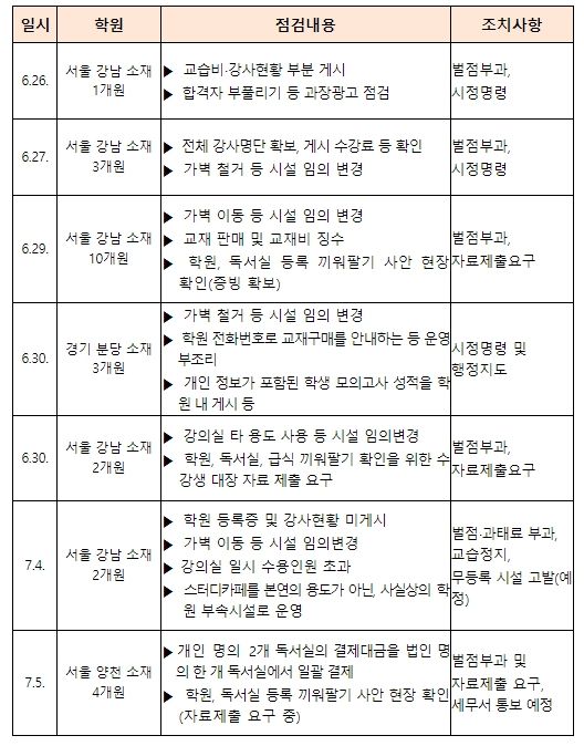 교육부는 사교육 부조리에 대해서도 엄정한 조치를 취한다. 사교육 부조리는 교습비 등 게시의무, 교실 당 학생 수용 인원 상한, 허위·과장광고 금지 등 학원법 상 의무 등을 위반하여 사익을 추구하는 행태로 집중신고기간 동안 총 285건의 신고가 이루어졌다. 지난 7월 3일에는 일부 대형 입시학원의 10건의 허위·과장 광고에 대해 공정거래위원회 조사를 요청했으며, 이번 7월 7일에는 추가로 5건의 공정거래위원회 조사 요청이 이루어진다. 아울러, 교육부와 시도교육청은 6월 26일부터 신고 사안을 중심으로 25개 학원에 대한 합동점검을 실시하여 수강생 초과 수용을 위한 임의 시설변경, 교습비 게시 의무 위반 등을 적발하고 벌점‧과태료 부과, 시정명령 및 교습정지, 고발 등 엄정한 조치를 취했다.