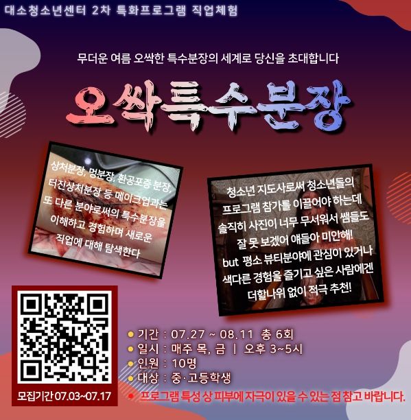 상처 분장, 멍 분장, 환공포증 분장, 터진상처 분장 등 특수분장의 세계로 안내 및 새로운 직업 탐색의 기회를 제공하며 오는 17일까지 모집한다.