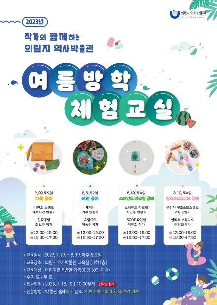 [제주교통복지신문 김강석 기자] 의림지 역사박물관이 오는 7월 29일부터 8월 19일까지 방학을 맞은 아이들을 위해 여름방학 공예체험 프로그램을 운영한다.