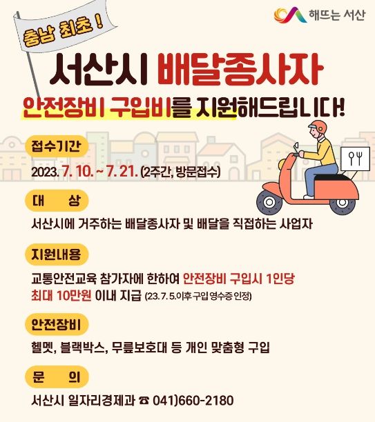 [제주교통복지신문 김강석 기자] 충남 서산시가 충남도 내 최초로 지역 배달종사자 안전 지원에 팔을 걷었다.