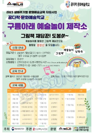 [제주교통복지신문 김강석 기자] 도봉구 도봉기적의도서관은 2023년 생애주기 문화예술교육 ‘꿈다락 문화예술학교’ 공모에 선정된 예술공동체 스케네와 공동으로 7월 26일부터 11월 29일까지 중장년을 위한 문화예술교육 '구름 아래 예술놀이 제작소-그림책 재담꾼! 도봉쑨'을 진행한다.