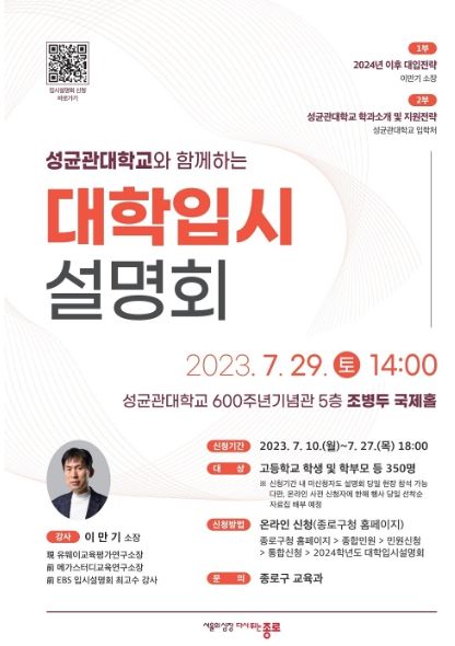 [제주교통복지신문 김강석 기자] 종로구가 수험생의 성공적인 대입 합격을 위해 오는 7월 29일 오후 2시 성균관대학교 600주년기념관 5층 조병두 국제홀에서 「2024학년도 대학입시 설명회」를 개최한다.